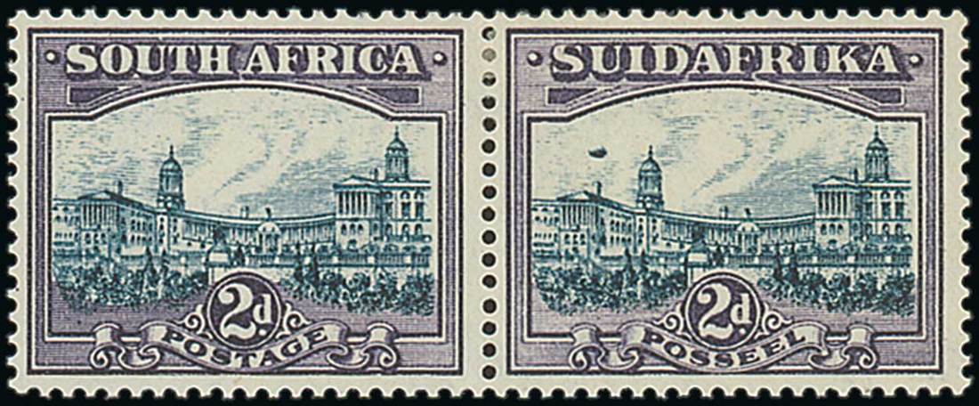 2d. blue and violet horizontal pair, the Afrikaans stamp with airship flaw, fine mint with a small hinge remainder. Scarce. S.G. 44ea, £950. Photo