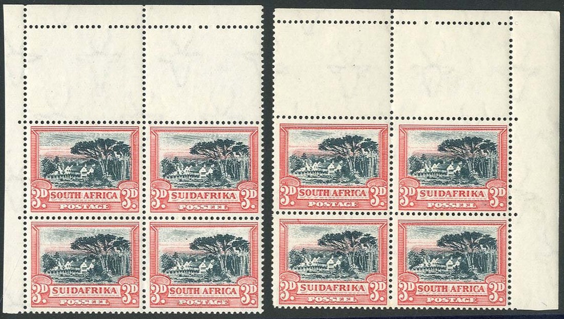 3d. black and red watermark upright upper left and upper right corner blocks of four, fresh mint, the first unmounted, the second mounted only in top margin; fresh and fine. S.G. 45, £520