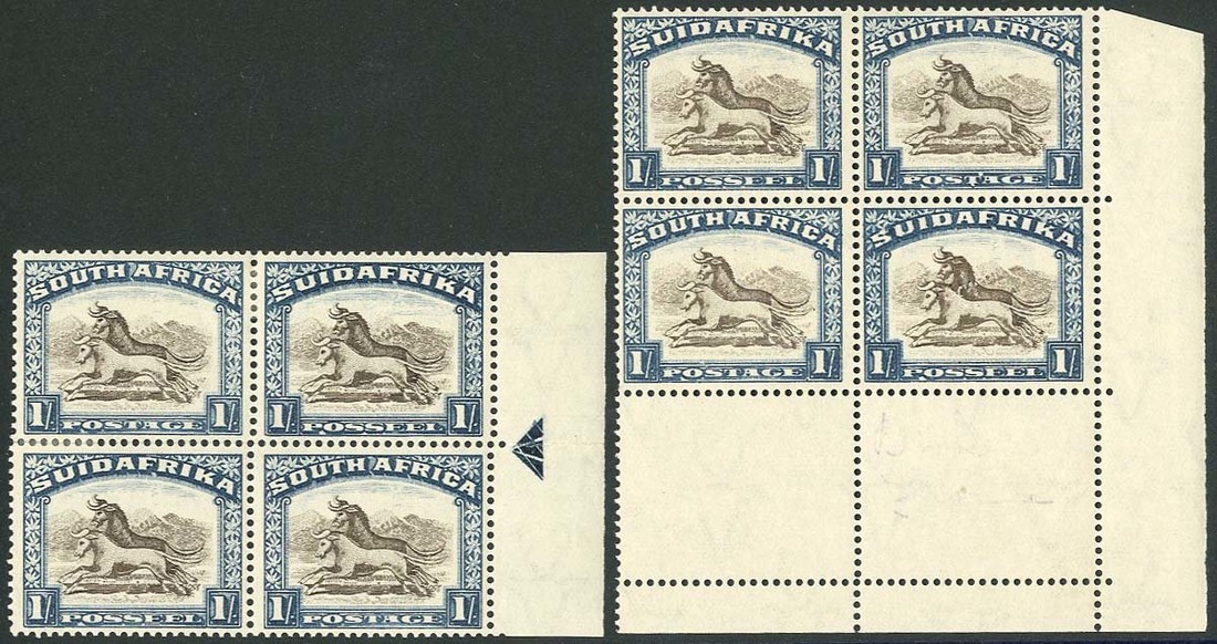 1/- brown and deep blue watermark upright marginal "arrow" block of four from the right of the sheet and a lower right corner block of four, fresh mint; the first with a couple of perfs. re-enforced. S.G. 48, £480