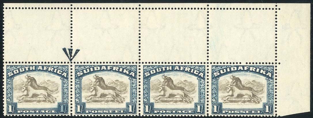 1/- brown and blue watermark inverted upper right corner "arrow" strip of four, the third stamp variety twisted horn, the first stamp with over-inked right-hand value tablet, mint and mounted in margin only; minor discolouration of gum. S.G. 48cw