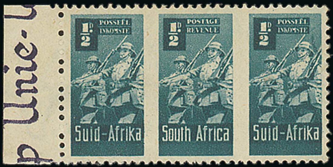 ½d. blue-green marginal unit from the left of the sheet, variety roulettes omitted, fresh mint; small gum bend at upper right, otherwise fine. Scarce. S.G. 97c, £1,400. Photo
