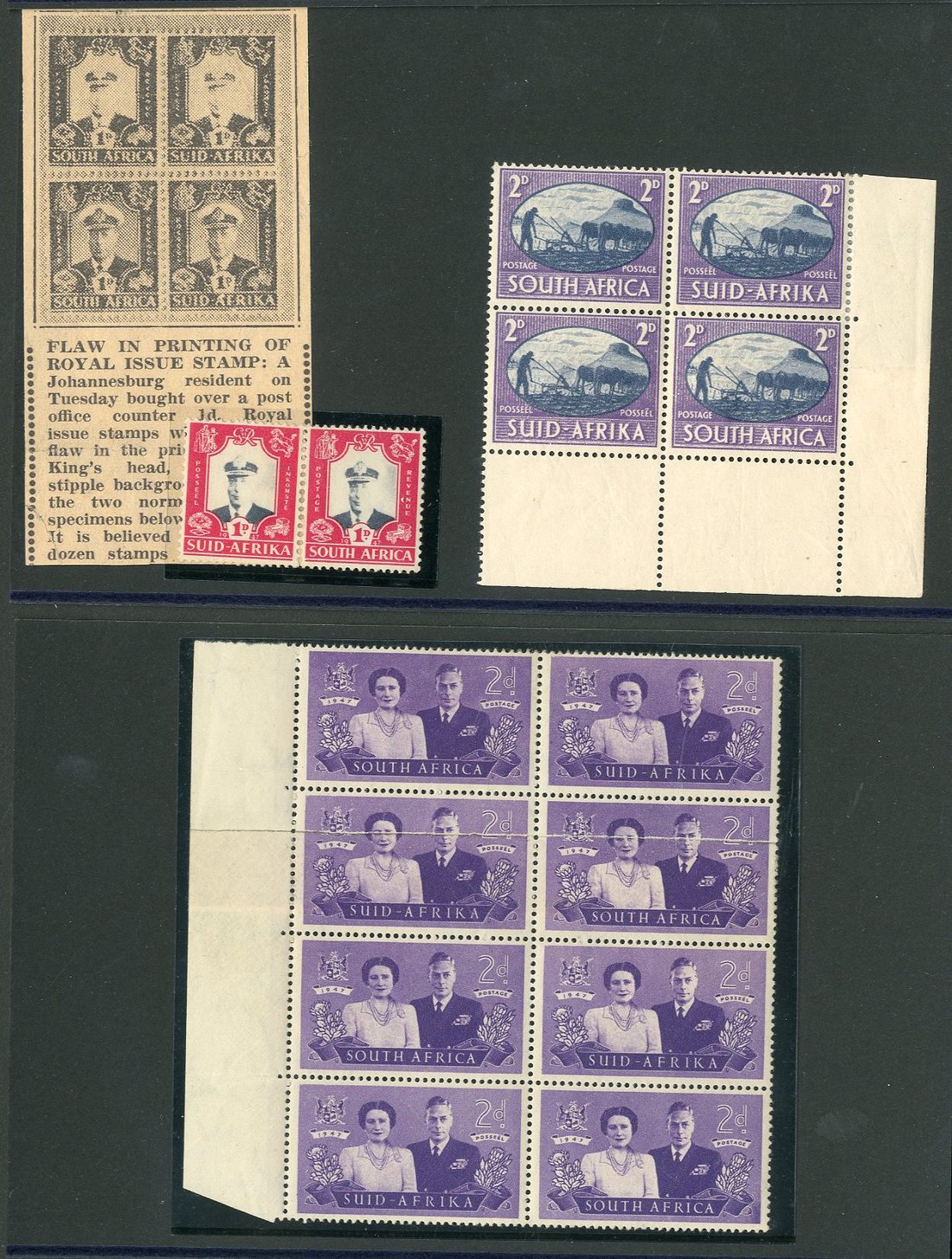 1945 Victory 2d. corner block of four with paper join, 1947 Royal Visit 1d. pair with partial dry print of the vignettes and 2d. marginal block of eight, the second horizontal pair with paper join, mint