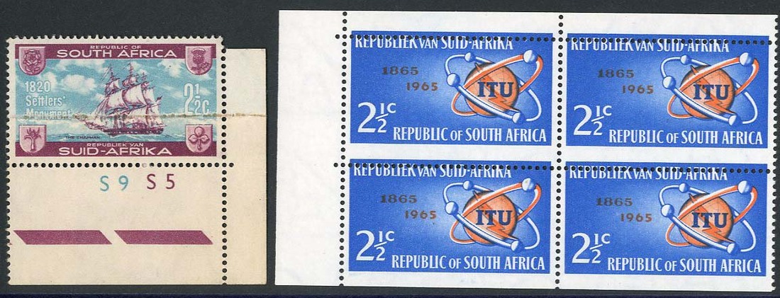 1962 Precinct Stone 2½c. cylinder number corner single with paper join and 1965 I.T.U. 2½c. upper left corner block of four with horizontal perforations misplaced 3mm. and giving appearance of being "imperforate between; fine unmounted mint