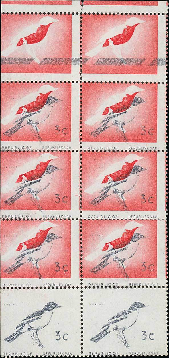 Note: The missing deep blue results in the loss of the value, country name, inscriptions and much of the bird detail. The error occurred completely on rows three, four and five of sheet number 7380 and partially on rows two and six. It also exists from the bottom row of a miss-cut sheet with a down shift of red. It is unknown if the entire row was affected or survives as the error was unrecorded in this format prior to its appearance at a July 2008 IPS auction in Johannesburg where a gum-damaged strip (comprising one example completely missing deep blue) sold for ZAR 40,250. It is possible the IPS strip, and any similar vertical strips if they exist, came from a proof sheet given the tatty appearance and the fact the item appears to have been miscut, has a significant down shift of red, and a weak printing of deep blue