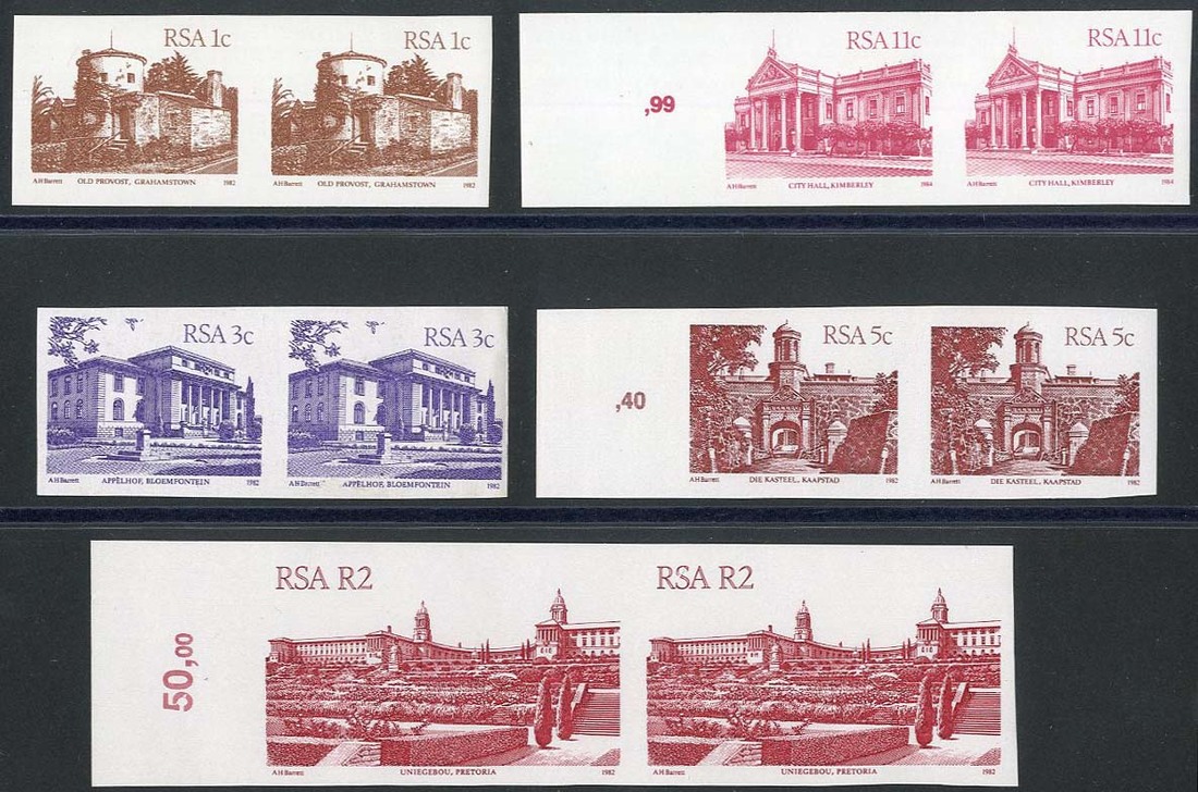 1982-87 Architecture, litho 1c., 11c. and recess 3c., 5c. and R2 horizontal pairs, all variety imperforate, three marginal with value indicators, fine unmounted mint