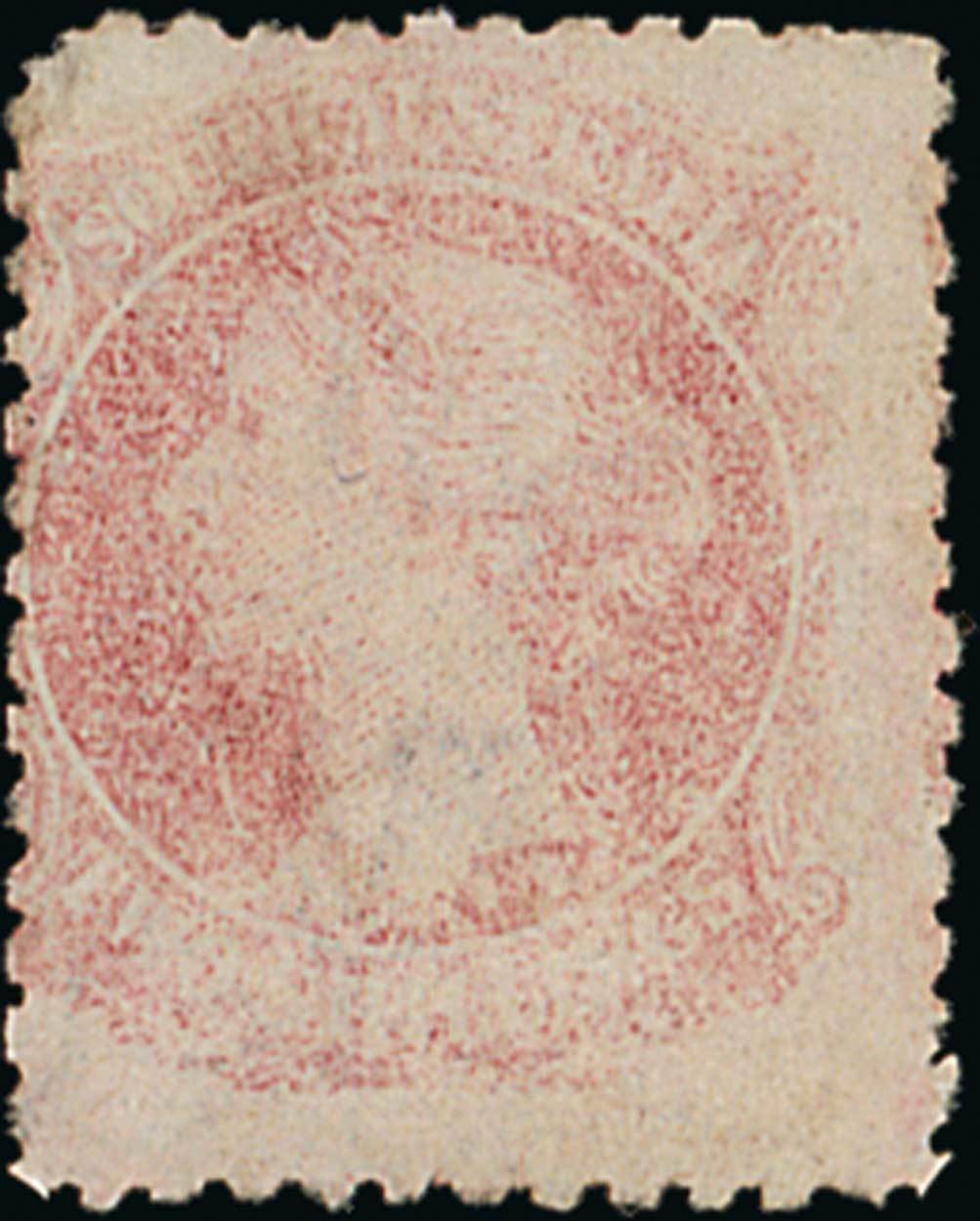 1868-79 watermark Large Star, perf 11½-12½, 2/- carmine showing variety printed on both sides (inverted), neatly cancelled with part Adelaide c.d.s., fine. Very rare and much under-catalogued. S.G. 87a, £750. Photo