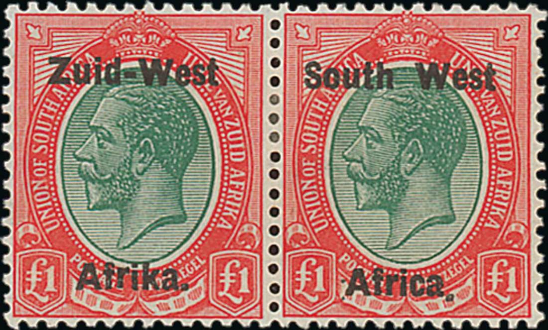 Stop and dot varieties selection, comprising dropped stop after "Africa" [234] on 3d., 4d., 6d., 1/-, 10/- and £1 pairs, dropped stop after "Africa" [123] on ½d., 1d., 2d., 4d., 6d., 2/6d. and 5/- pairs, no stop after "Afrika" in ½d. block of four, 1d. interpanneau block of eight and 4d. pair, and no dot on "i" in "Zuid" on ½d., 1d., 4d. and 1/3d. pairs. Photo