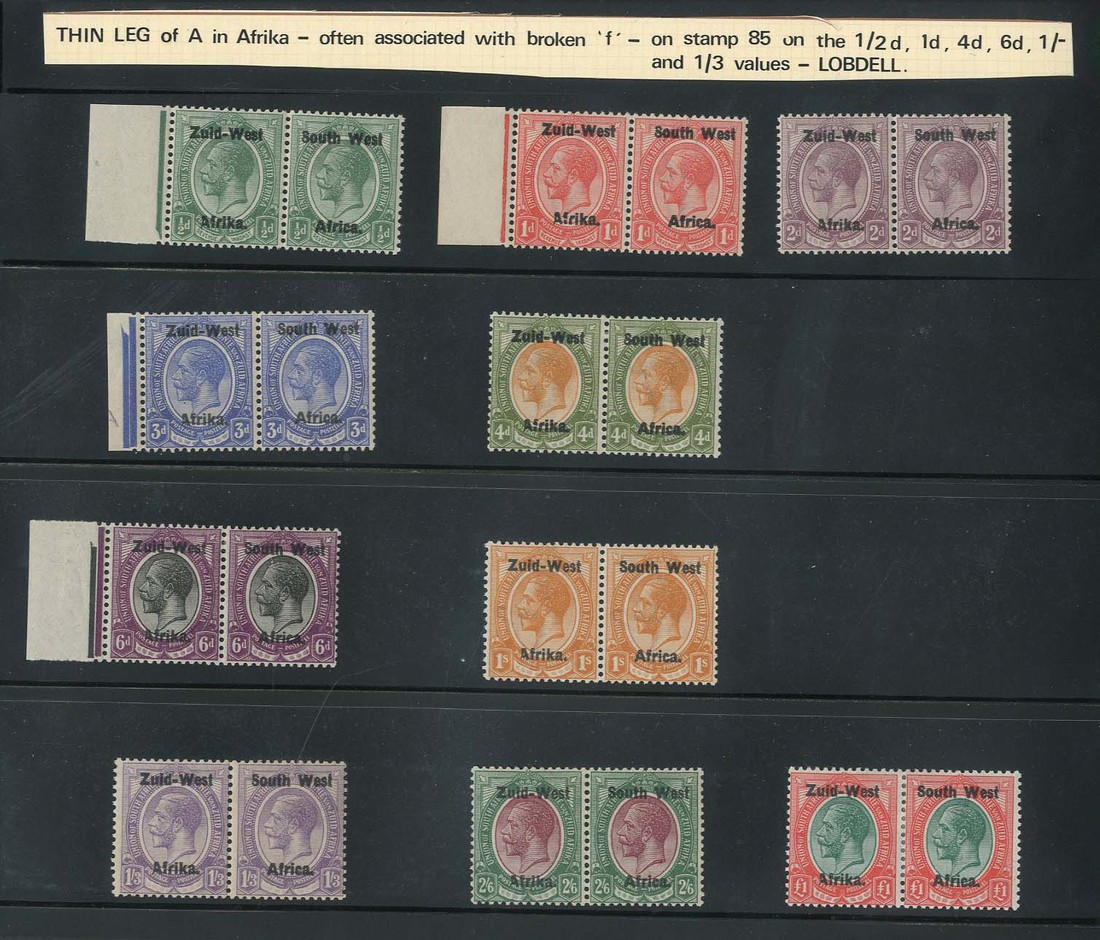Thin leg of "A" of "Afrika" on ½d., 1d., 2d., 3d., 4d., 6d., 1/-, 1/3d., 2/6d. and £1 horizontal pairs, mint; one £1 with a thin, otherwise good to fine mint