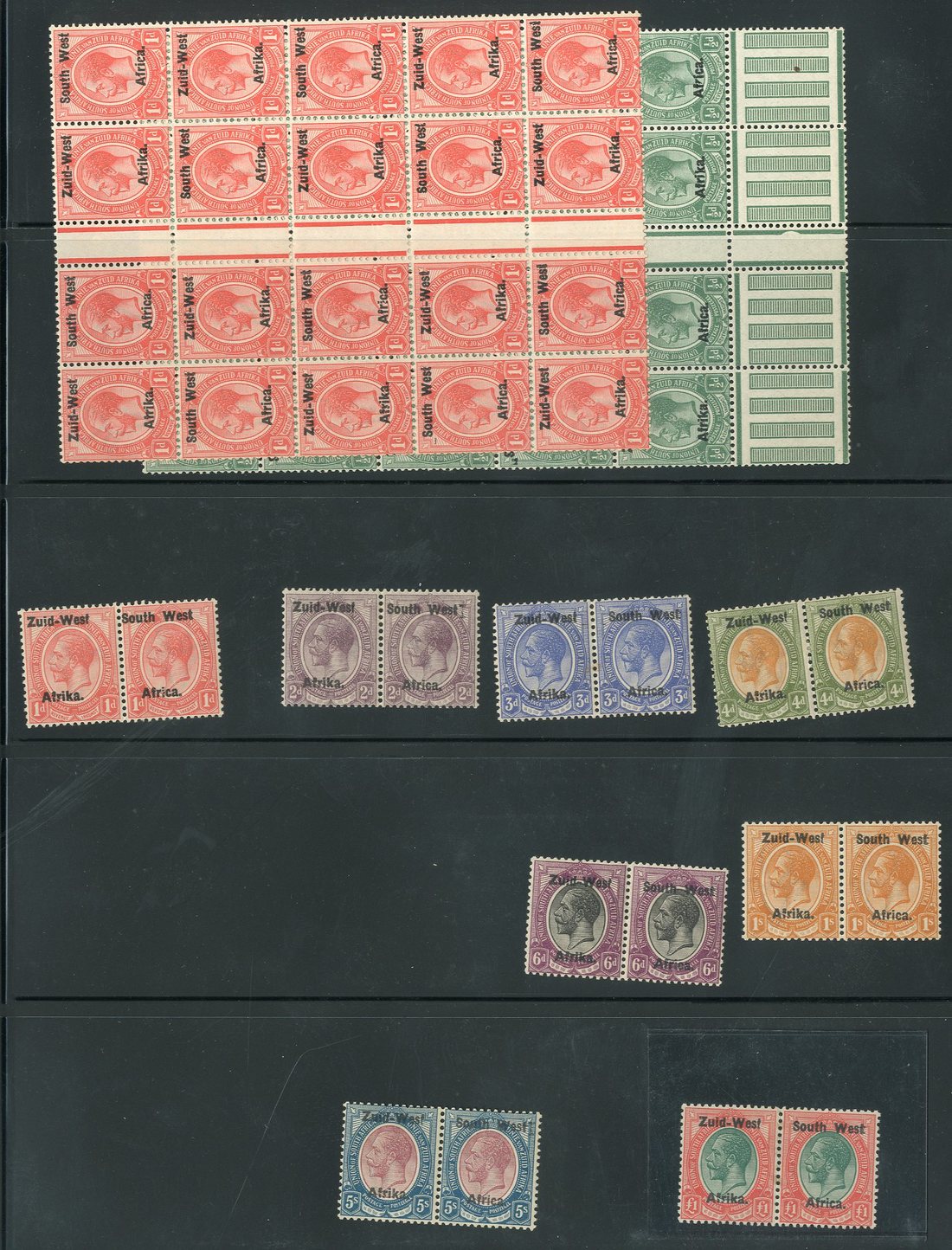 Broken "fr" in "Afrika" and damaged "t" in "Zuid-West" on ½d. and 1d. interpanneau blocks of twenty, 1d., 2d., 3d., 4d., 6d., 1/-, 5/- and £1 horizontal pairs, good to fine mint