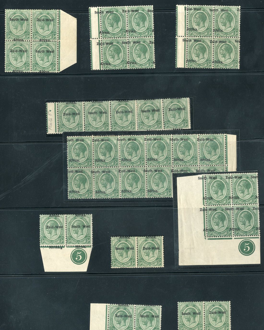 ½d. green selection of misplaced overprints with all showing portions of some letters falling on other stamps, comprising blocks of twelve and four (4, one with plate number), a strip of five with "Africa./Afrika." above "South West/Zuid-West" and pairs (4, three showing "Africa./Afrika." above "South West/Zuid-West" and one with "South West/Zuid-West" only with just a trace of the remainder of the overprint at foot), good to fine mint; a few small imperfections though an unusual group