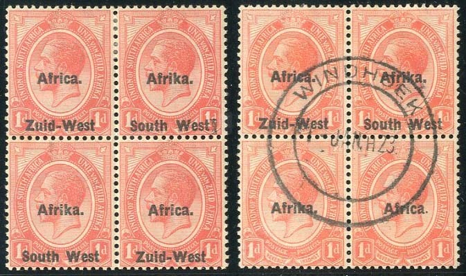1d. rose-red mint and used blocks of four, both variety "Africa./Afrika." above "South West/Zuid-West"; the mint block with a small stain on gum, the used block neatly cancelled by fine central Windhoek 1 January 1923 first day of issue datestamp. SACC 2j