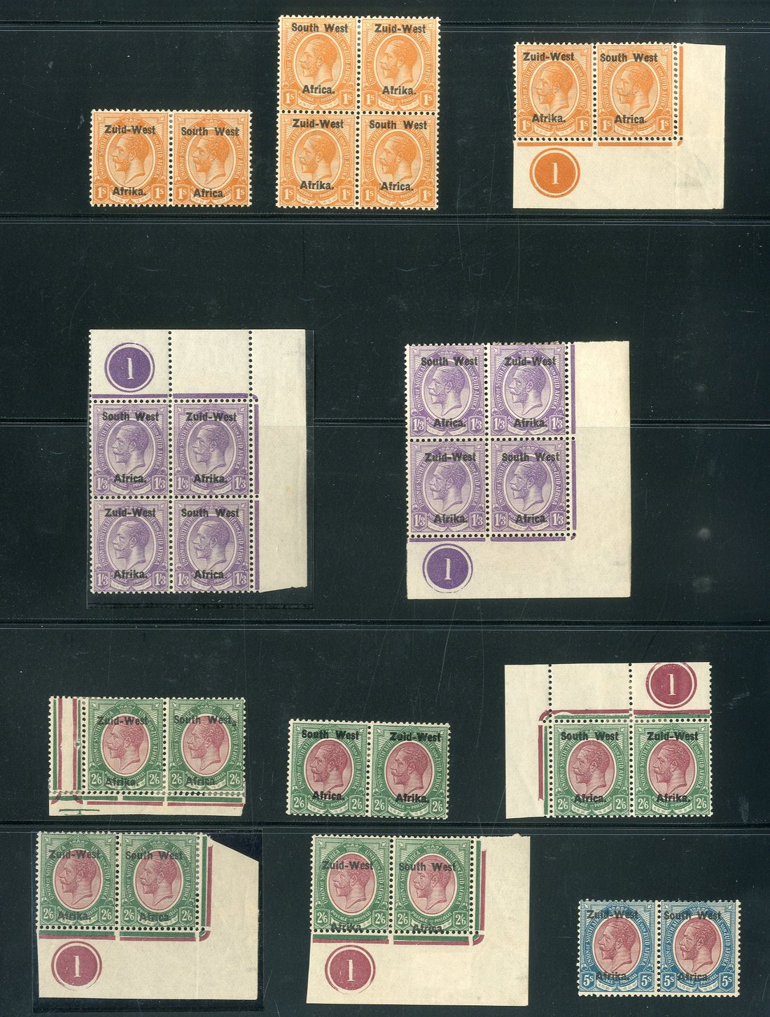 2d. to 5/- selection including 2d. Plate 1 blocks of four or eight from the four corners, 2d. Plate 2 block of four and a corner pair with misplaced overprints, 2d. block of four (surface rubbing) with "t" of West" largely omitted, 3d. pane of sixty. plate block of twelve (2) and four (2) and a pair with only a trace of a stop after "Africa", 4d. plate block of four and pairs (2), 6d. block of eighteen with one showing "Z" in original design largely missing, corner block of four and pairs (2) with plate number, 1/- corner plate number pair, 1/3d. plate block of four, 2/6d. corner pairs (3) with plate number, 2/6d. horizontal pairs (2) and 5/- pair, mint and generally good to fine