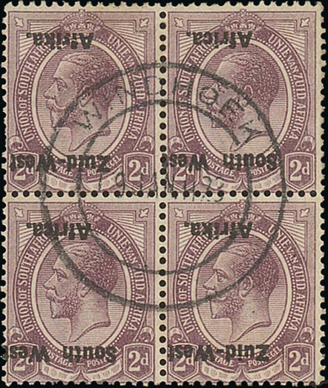2d. dull purple block of four, variety overprint inverted, neatly cancelled with central Windhoek January 1923 datestamp; upper left-stamp with a few short perfs. at left, otherwise fine. Scarce. S.G. 3a, £1,600. Photo