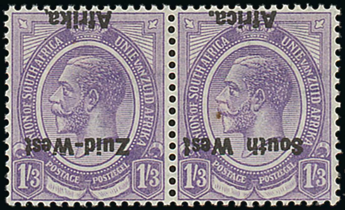 1/3d. horizontal pair, variety overprint inverted, lightly mounted mint; one with small brown mark on face. S.G. 8a, £400. Photo