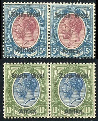 5/- purple and blue and 10/- blue and olive-green horizontal pairs showing different states of variety dropped stop after "Africa", mint; the 5/- with a covered thin, the 10/- very fine and unmounted. S.G. 10, 11 var, £1,625