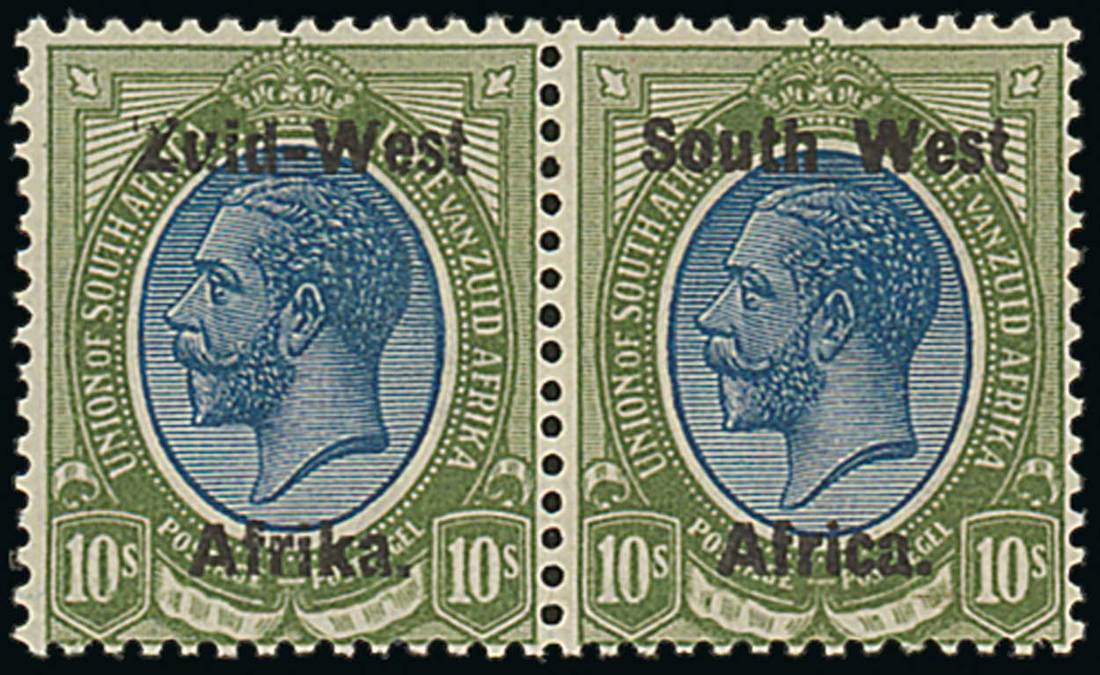 10/- blue and olive-green horizontal pair, variety missing top of "Z" in Zuid", [69], fresh mint. A most unusual variety. S.G. 11 var, £1,400. Photo