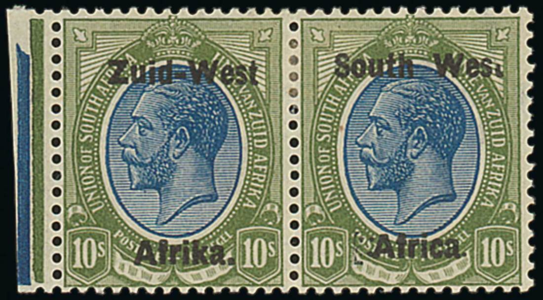 10/- blue and olive-green horizontal pair with narrow Jubilee lines margin at left, variety "Wes" for "West", [158], mint with small hinge remainder; variety stamp with tiny light mark at left of oval. S.G. 11 var, £1,400+. Photo