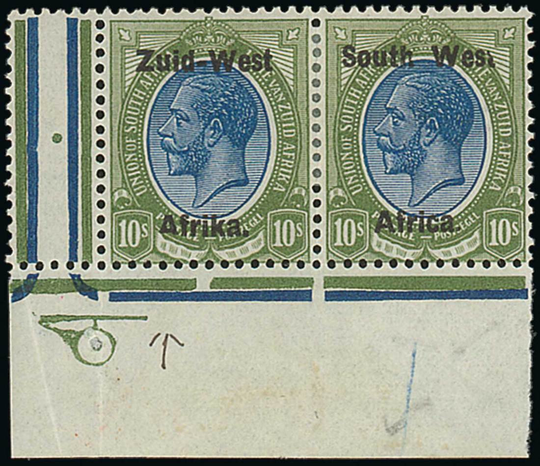10/- blue and olive-green lower left corner horizontal pair with interpanneau margin at left, variety "Wes" for "West", [236], mint; trace of gum bends and some perfs. between severed and re-inforced. S.G. 11 var., £1,400+. Photo