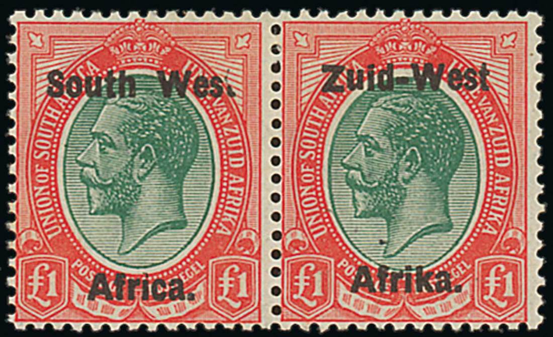 £1 green and red horizontal pair, variety "Wes" for "West" and broken stop over "i", [193], mint; small printers ink mark on neck of Afrikaans stamp. S.G. 12. Photo