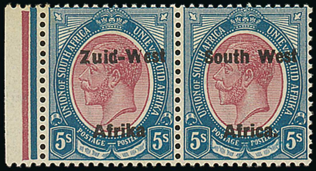 5/- purple and blue horizontal pair with narrow Jubilee lines margin, variety "Afrika" without stop and weak right limb of "W", fresh mint. Scarce. S.G. 13a, £1,200. Photo