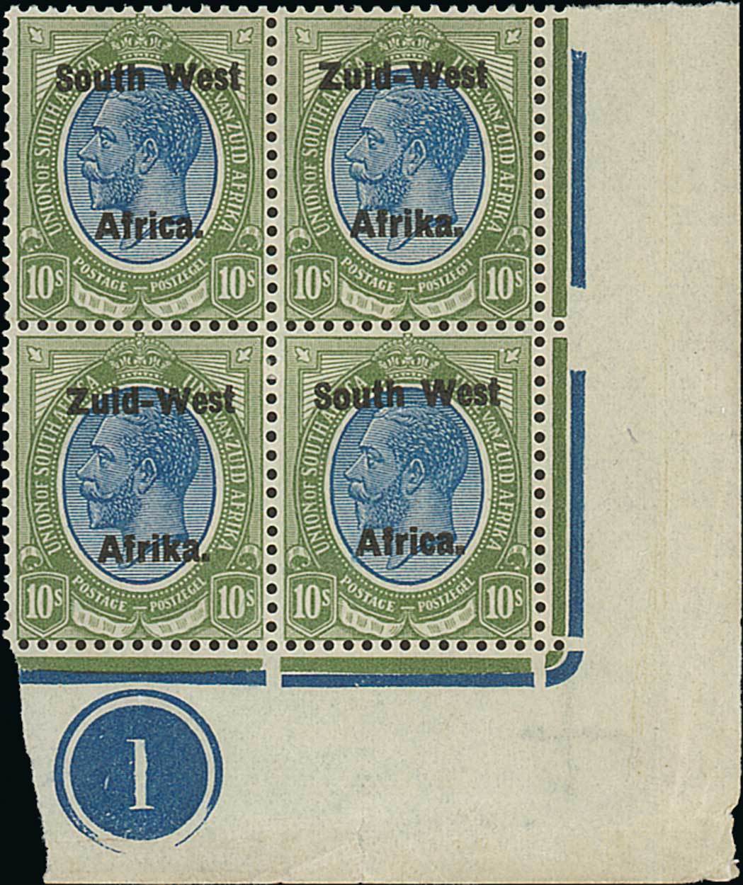 10/- blue and olive-green lower right corner plate number block of four, fresh mint; a few small imperfections in lower margin, otherwise fine. A rare positional multiple. S.G. 14. Photo
