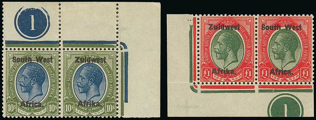 2d. (3), 4d., 6d., 1/-, 1/3d. (2), 5/-, 10/- and £1 corner plate number pairs, and 4d. interpanneau block of four, mint; one £1 stamp with tone patch on reverse though generally good to fine. Photo for 10/- and £1