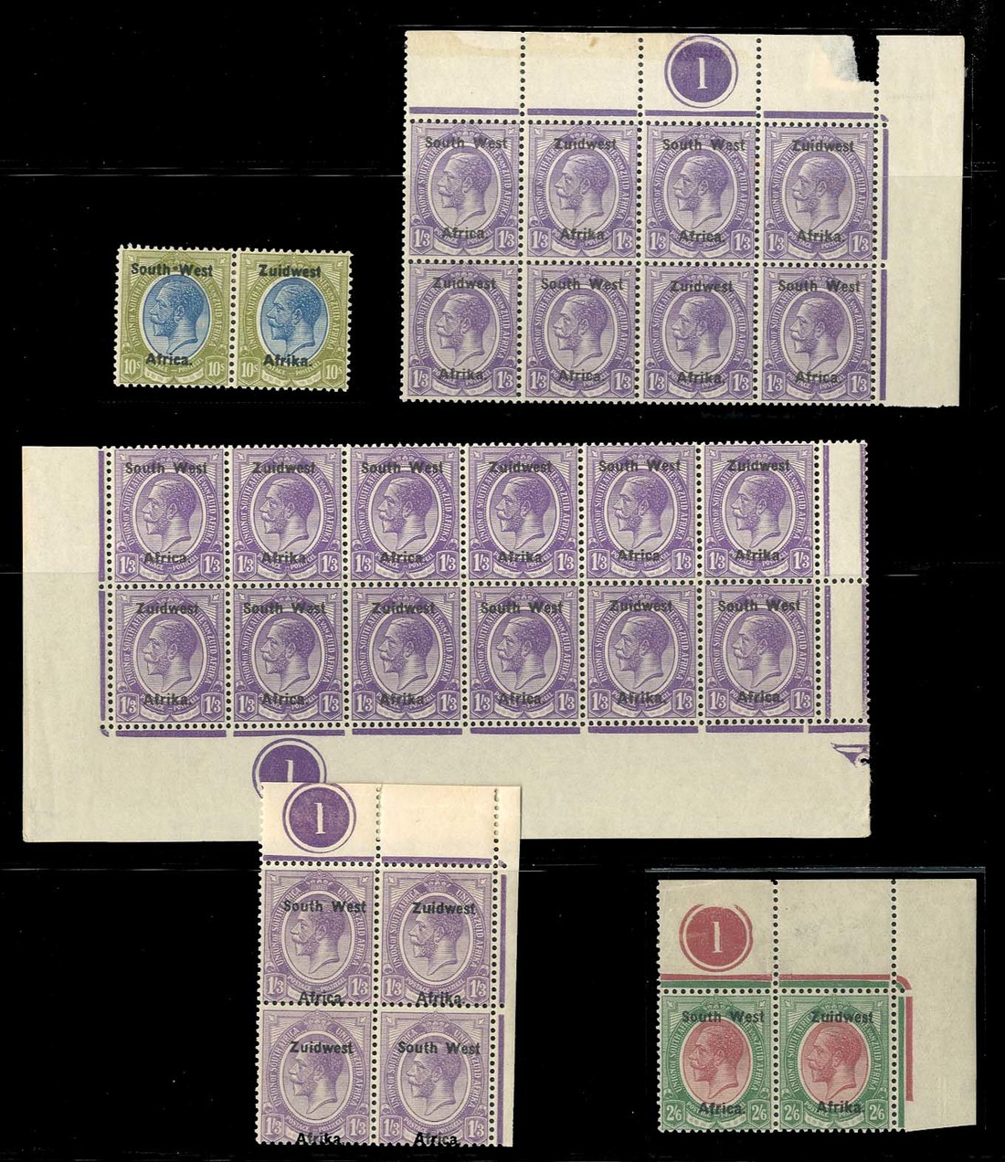 ½d. blocks of eighteen, twelve (2), eight (2), some with interpanneau margins, and four (5, four with Plate 7 from the four corners of the sheet), 1d. blocks of forty-eight and four (3, two with Plate 7 and one with variety "W st" caused by confetti flaw, defective corner), 2d. blocks of sixty with Plate 2, twenty-four (2, one with Plate 1), twelve with interpanneau margin, twelve, eight, four (3, two with Plate 2) and pairs (3), two with Plate numbers 1 and 2), 4d. corner plate number pair, 1/- plate block of twelve, 1/3d. block of twelve and corner plate blocks of eight and four, 2/6d. corner plate number pair and 10/- pair; generally good to fine mint. Cat. c. £1,800