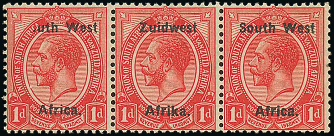 1d. rose-red horizontal strip of three, the left-hand stamp variety "outh" for "South", mint with only the centre stamp mounted. Fine and rare. S.G. 17a, £1,700. Photo