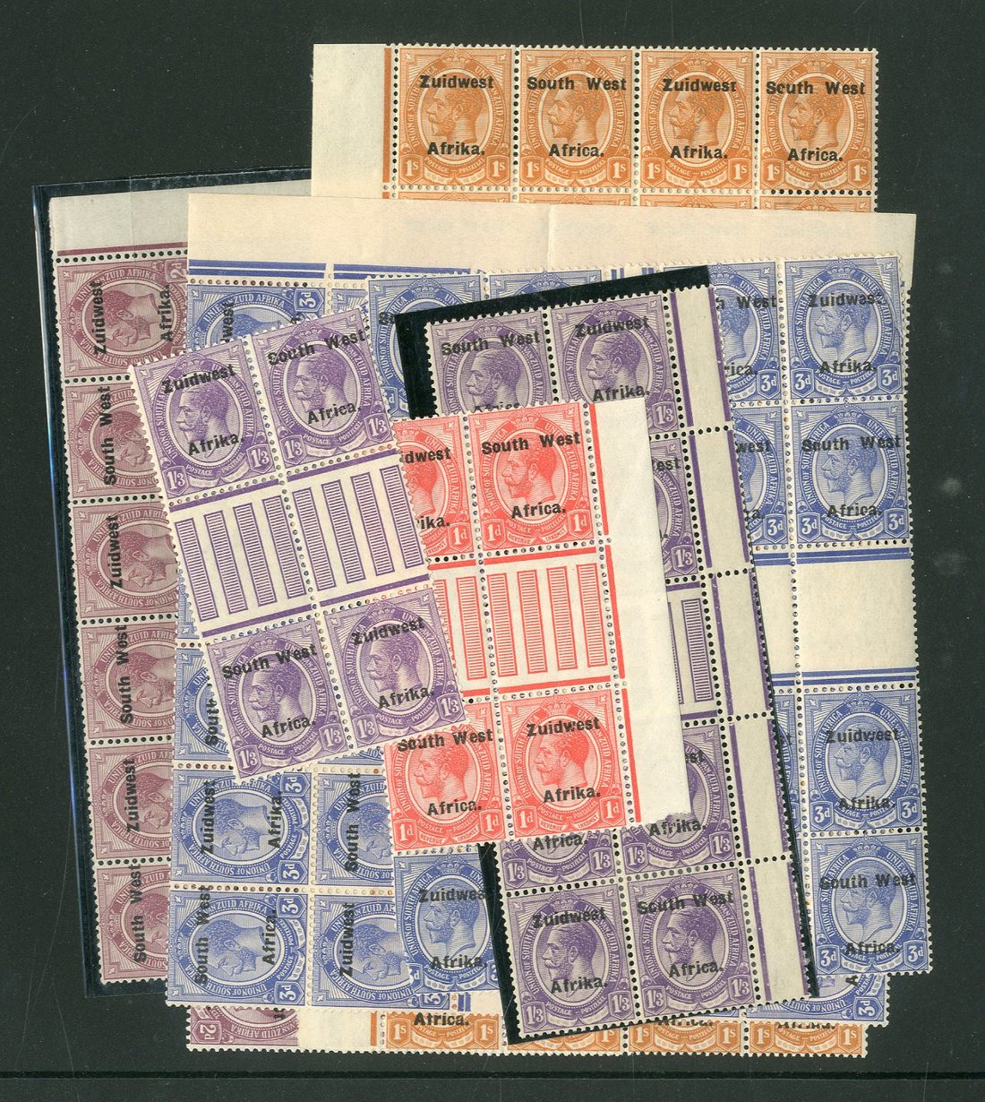 ½d. vertical blocks of twenty-four, sixteen, eight and four (2), ½d. horizontal blocks of twenty-four (2, one 12x2) and twelve, 1d. vertical block of four, 2d. vertical block of twenty-four, 3d. ultramarine vertical blocks of twenty-four, sixteen (from centre of the sheet) and four, 3d. horizontal block of twenty-four (12x2) and 1/- vertical block of twenty-four, 1/3d. vertical blocks of eight and four, all from the early printings with 16mm. on top stamps and 16½mm. overprint on lower stamps, and 2d. block of four from later printing with 16½mm. on top stamps and 16mm. overprint on lower stamps; one 3d. from the centre block of sixteen defective though generally fine mint