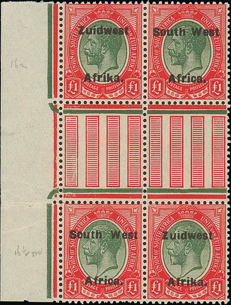 This issue was overprinted in complete sheets of 240 with initially "South West Africa" 16½mm. long on the upper two panes and 16mm. on the lower two panes. This order was subsequently reversed. For printings from 8 November 1926 all four panes had the 16½mm. measurement