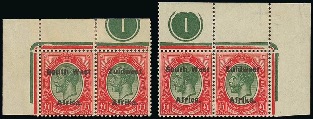 This issue was overprinted in complete sheets of 240 with initially "South West Africa" 16½mm. long on the upper two panes and 16mm. on the lower two panes. This order was subsequently reversed. For printings from 8 November 1926 all four panes had the 16½mm. measurement
