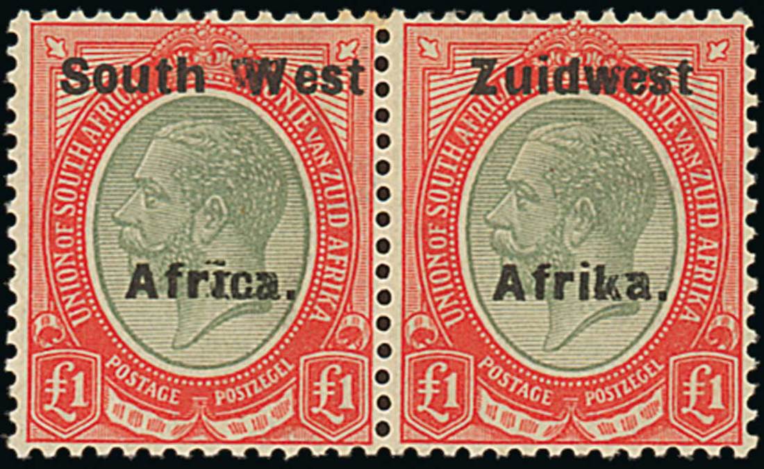 £1 pale olive-green and red horizontal pair showing traces of double overprint in places; mint; one with tiny fox mark in one corner on gum; fine appearance and unusual. S.G. 40a. Photo