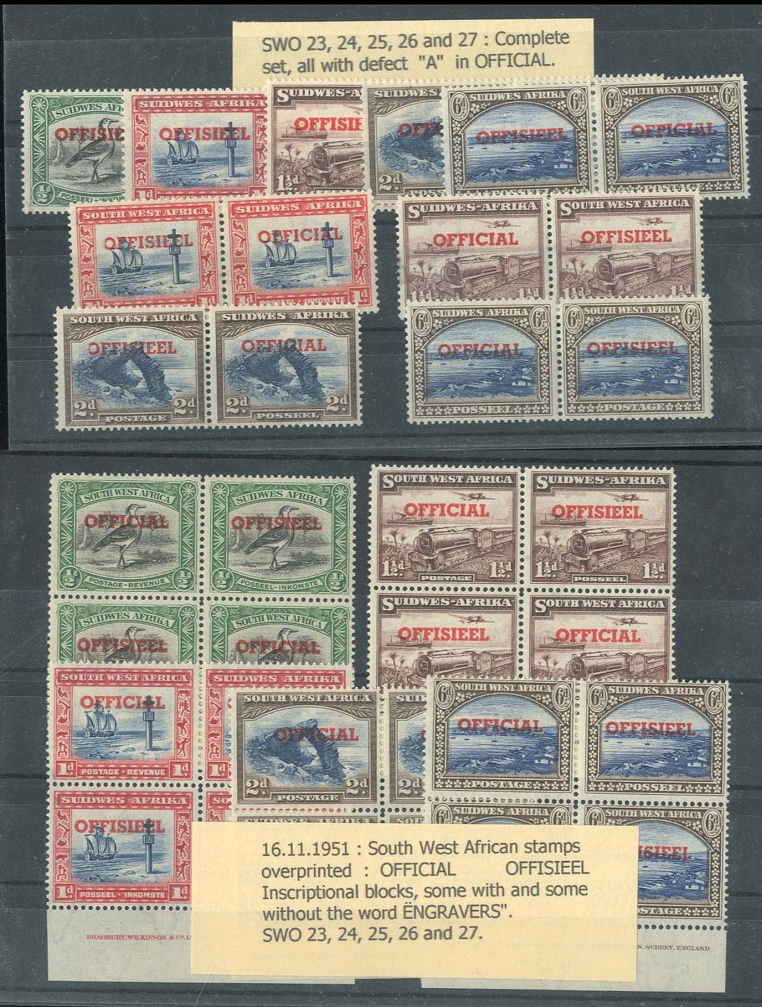 1931 set in horizontal marginal pairs with imprint, 1945 ½d. horizontal pair with "kiss print" double overprint (PFSA Certificate, 1987) and 1d. horizontal pair with overprint slanting diagonally by 3mm., 1951-52 set of five in marginal blocks of four with imprint, in horizontal pairs with defect in "a" of "official" and 1d. to 6d. in horizontal pairs with overprints transposed, fine mint with most unmounted