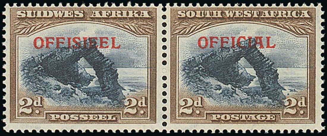 1947 2d. blue and brown horizontal pair, fresh lightly mounted mint. Scarce. S.G. O21, £700. Photo