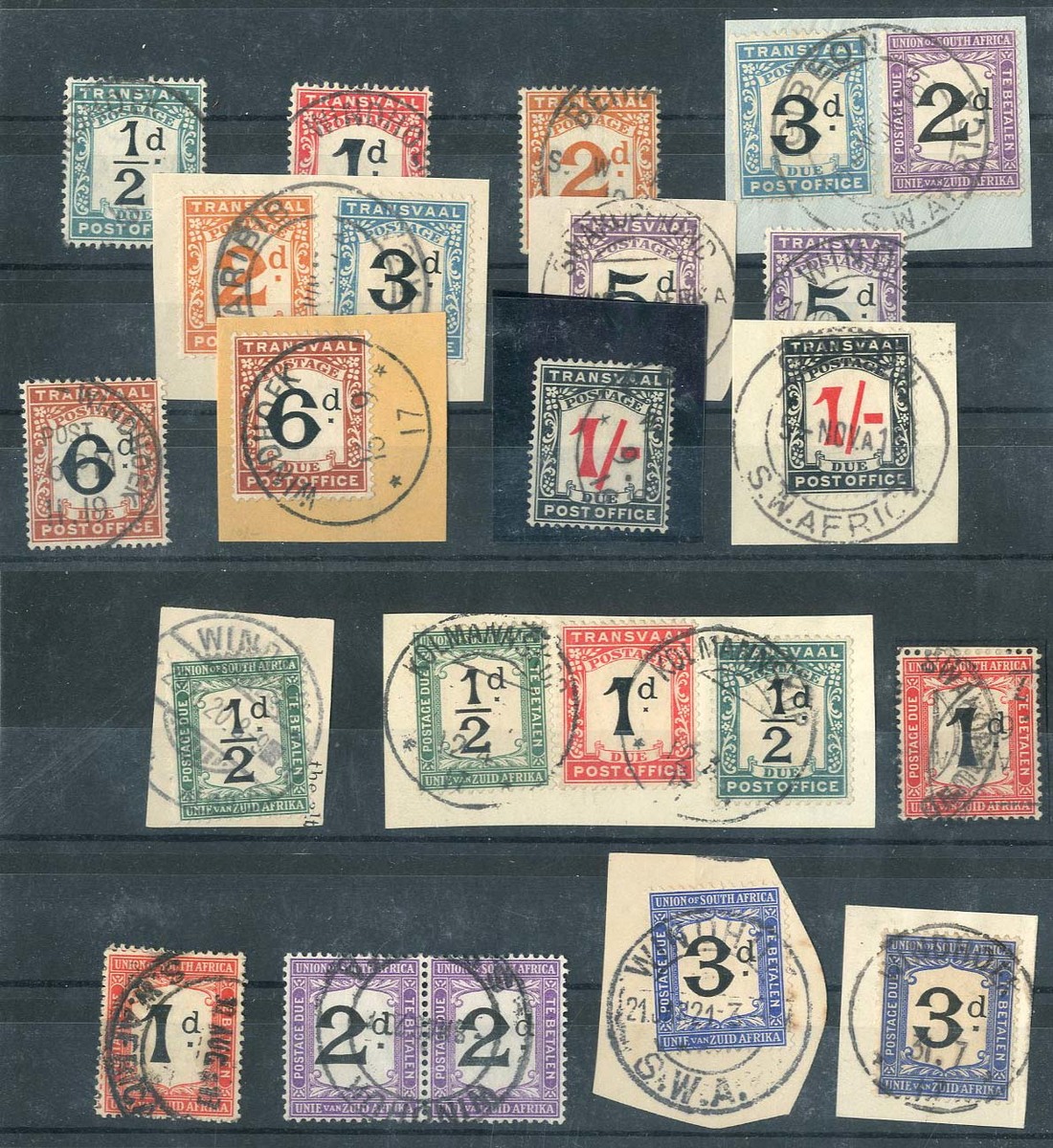 Transvaal ½d., 1d., 2d. (2, one on piece with 3d.), 3d. on piece with South Africa 2d., 5d. (2), 6d. (2) and 1/- (2, one on piece), and South Africa ½d. (3, one on piece with Transvaal ½d. and 1d.), 1d. (2), 2d. pair and 3d. (2, both on piece), variously cancelled and generally fine. ZD1-11, £491 plus Transvaal 1d. and 3d. which are unlisted and unpriced