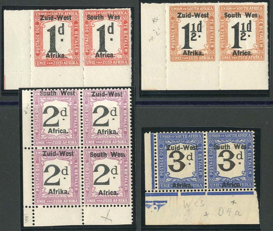 South Africa De La printing 3d. black and blue, South Africa Pretoria printing 1d. and 1½d. lower left corner horizontal pairs and 2d. lower left corner block of four, Row 10/2 showing "Wes" for "West" with merest traces to part visible, fine mint. S.G. D4a, 7a-9a