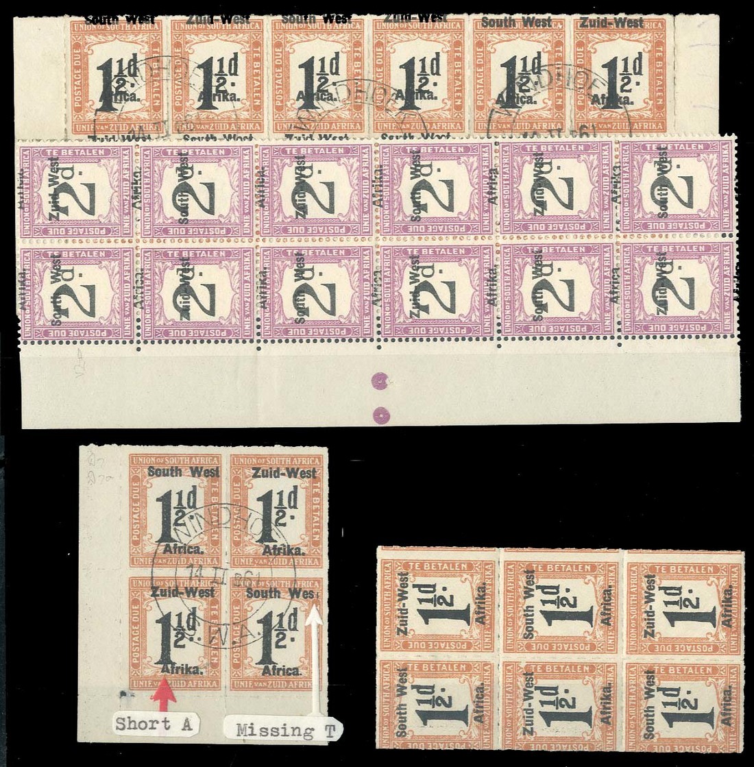 South Africa Pretoria printing, ½d. lower left corner pair with overprint displaced to foot, 1½d. block of six, a block of four with overprint displaced to top, two horizontal pairs with variety "Afrika" without stop, and 2d. marginal block of twelve with overprint displaced to top and a lower right corner block of four, mint , and 1½d. used blocks of twelve with overprints displaced to top and four with "Wes" for "West", both cancelled by favour in 1961; generally fine