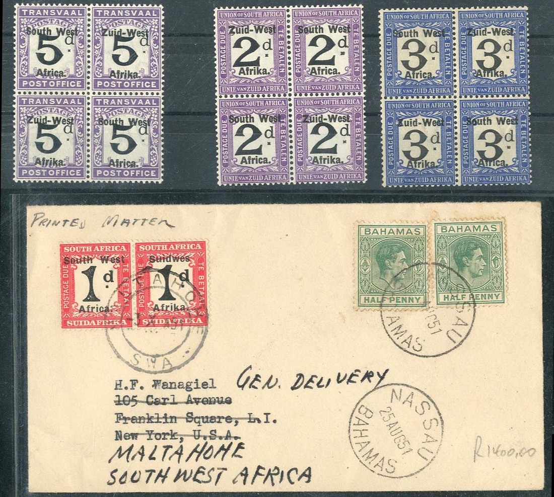 1923 (Apr.) Setting II, Transvaal 5d. and South Africa 2d. and 3d. blocks of four, 1928-29 on South Africa 1922-26 issue 3d. marginal block of four and 6d. block of four with one in each showing no stop after "A", 6d. corner block of eight and on South Arica 1927-28 6d. marginal single with no stop after "A", mint. Also 1927 1d. pair used on 1951 envelope franked at 1d. from Nassau to New York and redirected to Maltahome
