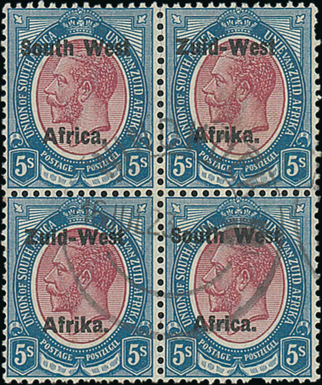 1923 Setting II 5/- purple and blue block of four, central c.d.s. cancellation,; a few short or split perfs., fine. S.G. 13, £550. Photo