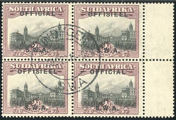 1929 (May) 2d, grey and purple block of four with interpanneau margin at right, each stamp showing variety no stop after "official" or "offisieel", centrally cancelled by Windhoek double-ring d.s., fine. S.G. O7c, £180