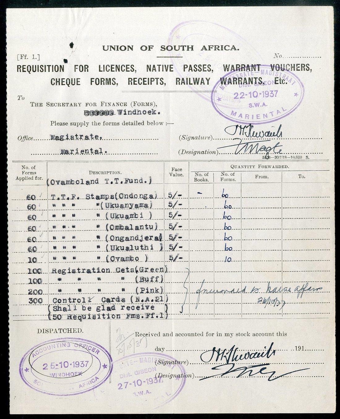 c.1940 collection of documents (12) relating to the administration of Tribal Tax; including unique 1949 Control card and registration certificate on yellow card, both endorsed "Specimen Card" in manuscript, requisition sheets (4) requesting new supplies of the stamps, the earliest dated 1937 requesting 5/- face value overprints for seven different tribes with registration and control cards, later1954 sheets (3), itemised by face value and tribe requesting further printings, finally two "Department of Administration" large sheets "Showing the number of Tribal Trust Fund Stamps received, sold and on hand" for 1944, and 1960, again itemised by tribe and face value. Lastly a letter concerning an order for tin holders for the native registration cards. A wonderful accumulation and a unique archival record of this fascinating issue.