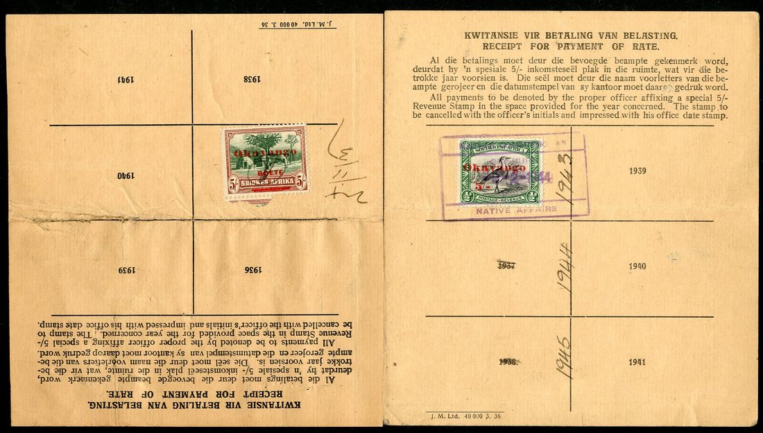 Group of Registration Cards for the years 1936-41, (3) the first paid for the year 1937 with 1933 5/- green and brown Penalty revenue (Afrikaans overprint), the second paid for the year 1943 (dates revised in manuscript) with 1931 postage ½d black and emerald overprinted "Okavango/ 5/-" in red, with folded perfs at foot, the final card named on face but bearing no stamps. Condition much above average, and a scarce trio, this lot containing two of the eleven recorded franked cards for this tribe.
