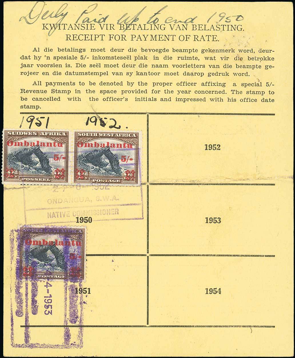 Pair of Registration Cards both endorsed "Duplicate" on face, The first paid for the years 1951-52 with 1931 postage 2d. blue and brown bi-lingual pair surcharged "Ombalantu/ 5/-" with diamonds obscuring original value, showing two different fraction strokes se-tenant, with additional single paying 1953 heavily cancelled, the second card franked for the year 1947 with 1931 postage 3d. grey-blue and blue similarly similarly without diamonds obscuring value, very fine. A splendid pair, this lot containing two of the seven surviving cards from this small tribe which provided only 1058 tax payers in 1935. Photo