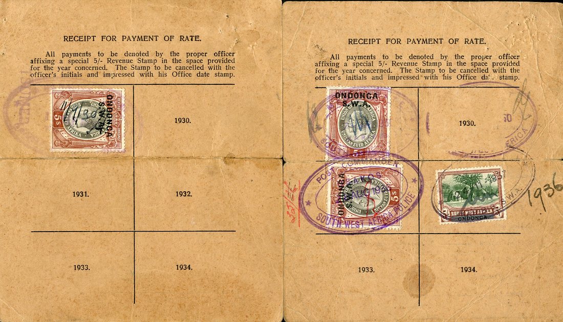 Registration certificates (2), the first bearing payments for 1935-37 paid with 1913 South Africa Revenue 5/- brown and grey overprinted "ondonga/ s.w.a." (2), and 1931 postage 5/- sage-green and red-brown overprinted with silver bar over postage and "ondonga", the card cancelled but missing the stamp for an additional year; the second card bearing a single 5/- brown and grey paying for 1929, the first year the tax was introduced.