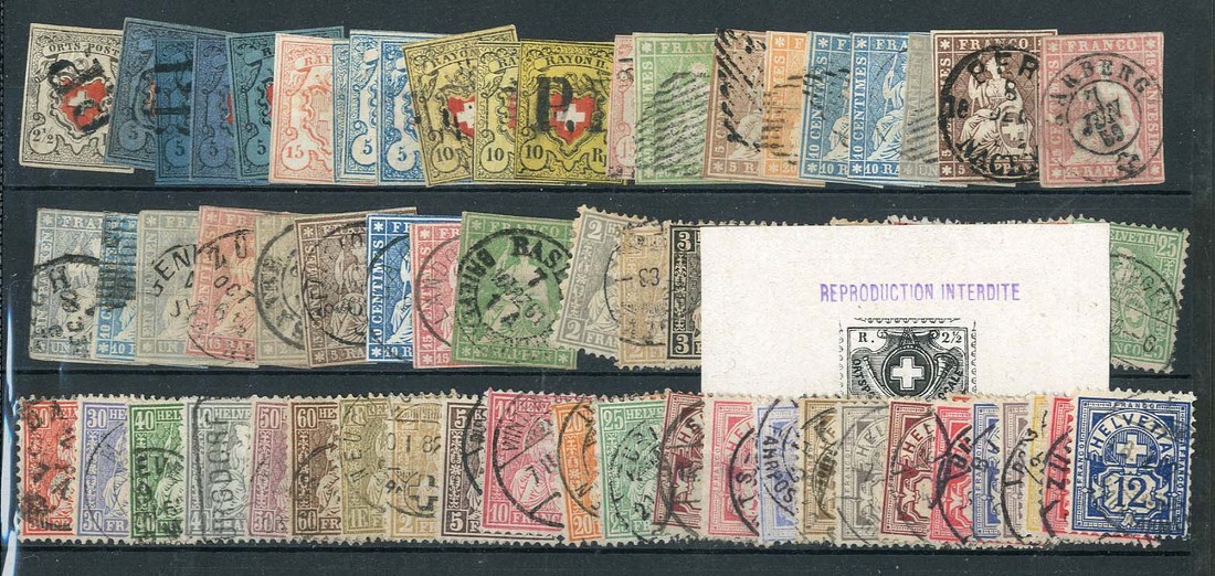 1850-1959 mint and used collection in a red Biella album and on stockcard, hundreds, including 1850 Orts Post framed cross 2½r. (repaired), 1850 Rayon I 5r. (4), 1851 Rayon I 5r. (3), 1852 small figures 15r., 1852 large figures 15r., 1854-62 with values to 1f. (3), 1862-64 60c., 1f., 1915 80c. on 70c. broken "8" variety, 1928-31 10f., 1945 PAX set, 1959 PTT set on first day cover. Also 2000 St. Gallen Embroidery miniature sheet (3), etc., chiefly good to fine