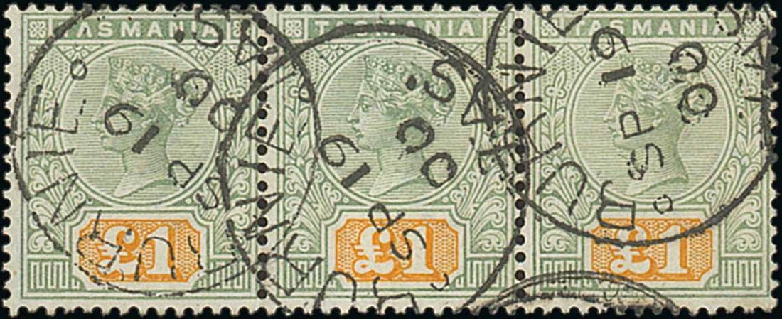 1892-99 £1 green and yellow strip of three, each cancelled by clear "burnie/sp 19/00/tas" c.d.s., fine. The largest known multiple from Burnie. S.G. 225, 1425+. Photo