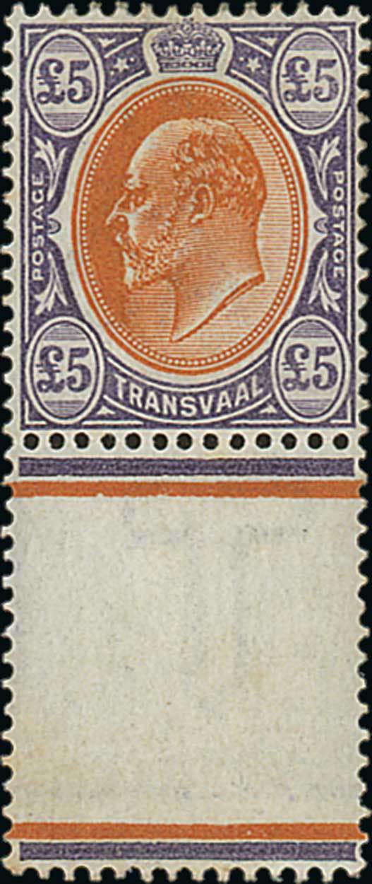 1903 £5 orange-brown and violet with interpanneau margin at foot, lightly hinged in margin only leaving stamp fresh unmounted mint. Extremely rare so fine. Brandon Certificate (1988). S.G. 259, £2250. Photo.