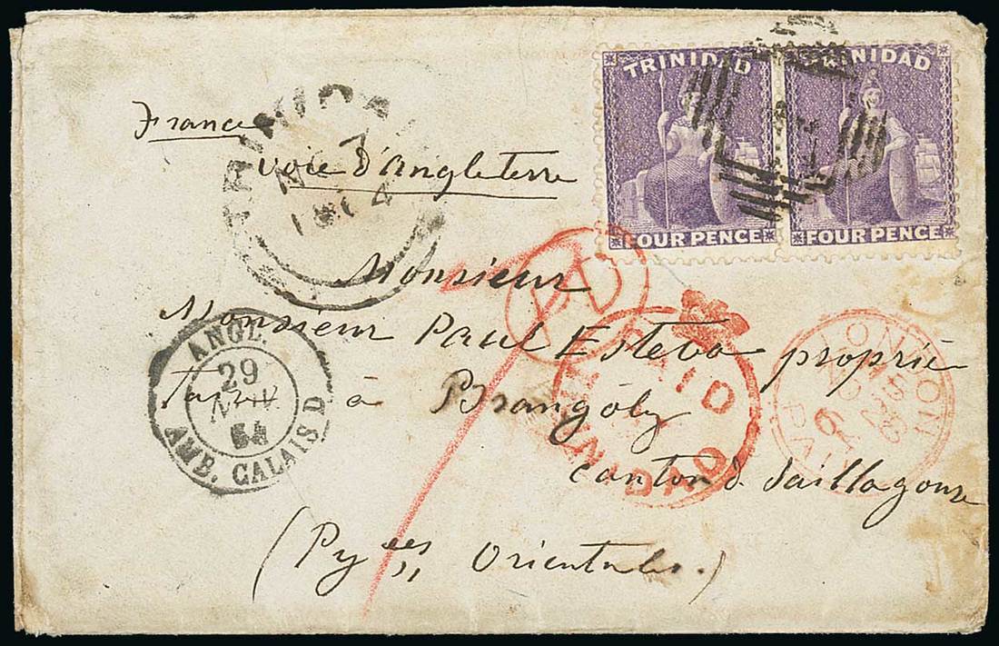 1864 (7 Nov.) envelope (complete with letter) "Voie D'Angleterre" to France, rated "7" in red crayon and bearing 1863 perf. 12½ 4d. dull lilac pair cancelled "1" and tied by oval-framed "pd", showing Crowned Circle handstamp, despatch datestamp, London Paid and Calais datestamps, all on face, the reverse (flap faults) with four French transit datestamps. Photo