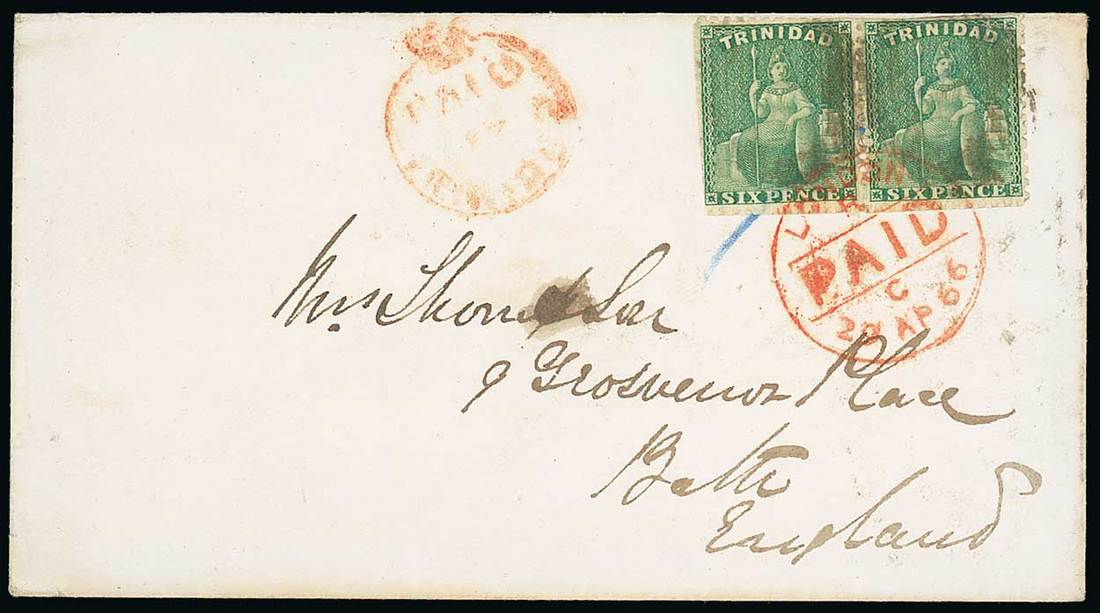1866 (7 Apr.) envelope to England, bearing 1863 perf. 12½ 6d. green pair (some perfs. trimmed) with indistinct cancellation and tied by London Paid (29.4) datestamp, Crowned Circle handstamp at left, despatch and arrival (30.4) datestamps on reverse. Photo