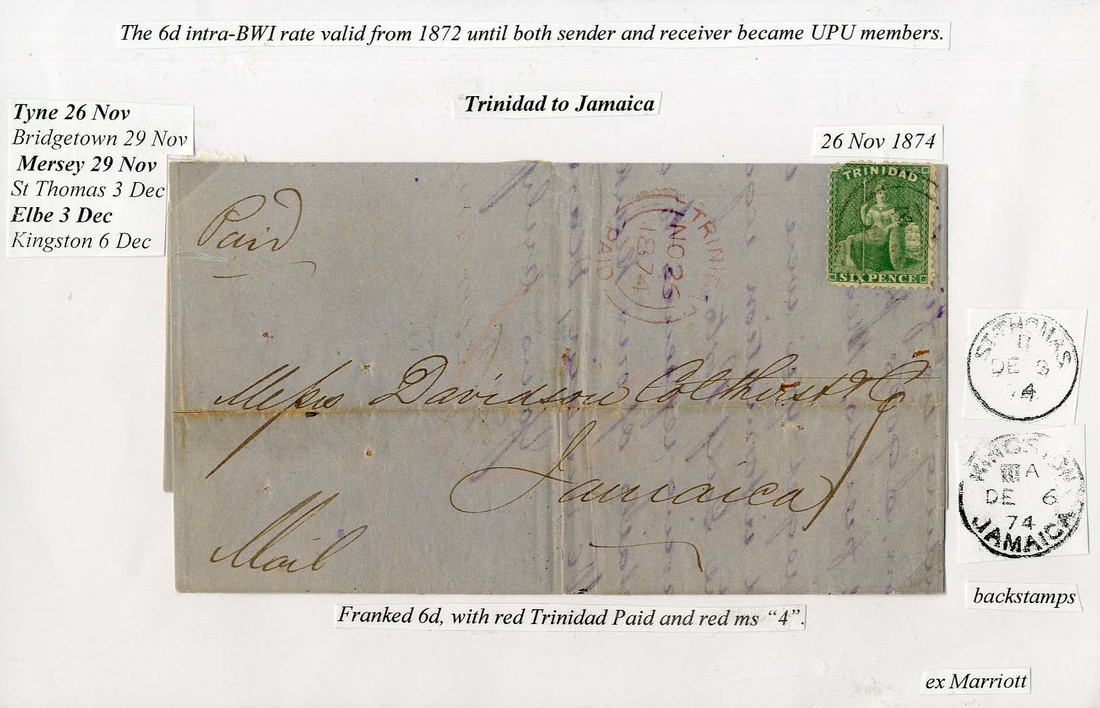 1874 (26 Nov.) entire letter (small imperfections) to Jamaica, bearing 1863 perf. 12½ 6d. yellow-green (corner defect) cancelled by double-arc datestamp, Trinidad Paid datestamp at left, St. Thomas and Kingston (6.12) datestamps on reverse
